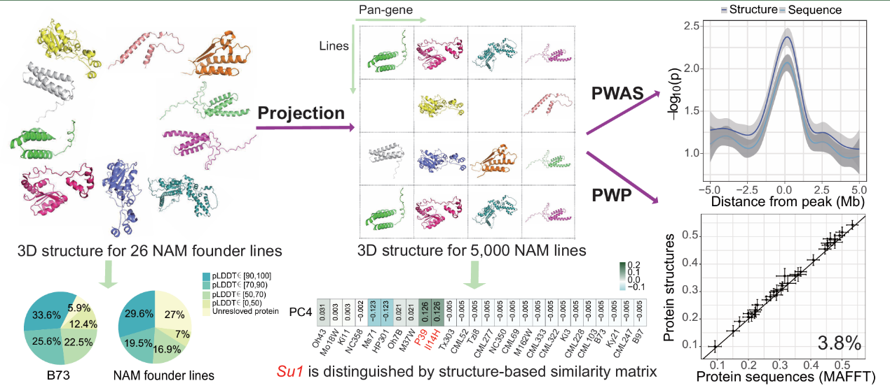 利用玉NAM群体的单倍型蛋白序列信息将亲本的蛋白质三维结构进行映射最终获得了约5000份的群体尺度的蛋白质结构信息(上图)。分别以蛋白质序列,蛋白结构作为基因型与表型进行关联分析(PWAS),结果表明蛋白质结构为基础的关联分析整体上有更高的统计显著性,并能鉴定到基于蛋白质序列关联所鉴定不到的候选基因。此外与传统的以SNP基础的GWAS相比,也能鉴定到一些独有的候选基因。