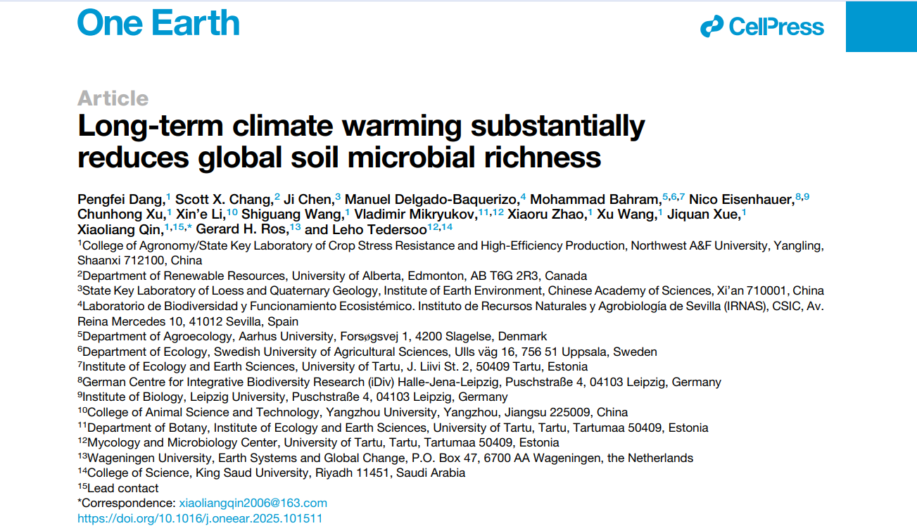 近日,永利集团秦晓梁教授课题组的一项新研究登上了Cell Press官网头条,在Cell姊妹刊《One Earth》(五年影响因子19.2)上发表了题为“Long-term climate warming substantially reduces global soil microbial richness”的研究论文。该论文以西北农林科技大学为第一完成单位,秦晓梁教授为通讯作者,博士生党朋飞为第一作者。研究系统揭示了长期气候变暖对全球尺度土壤微生物多样性的显著负效应,并指出其对土壤氮循环功能的重要影响。同时,该研究明确了温度、降水及土壤养分等关键环境因子在调控微生物响应过程中的作用,为气候变化背景下不同生态系统的微生物保护与综合管理提供了科学依据。此项成果是课题组继在《美国国家科学院院刊》(PNAS)发表论文“Long-term climate warming weakens positive plant biomass responses globally”之后取得的又一重要进展。