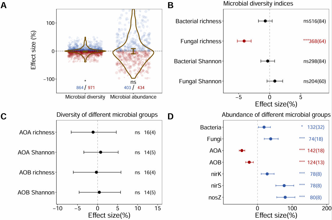 基于全球192个增温试验的2,786对观测数据,系统评估了气候变暖对土壤细菌与真菌多样性和丰度的影响。研究发现,气候变暖显著加剧全球生态系统土壤微生物多样性的丧失,变暖显著降低了土壤真菌丰富度,但对细菌丰富度及细菌和真菌的Shannon指数无显著影响。变暖显著减少了AOA和AOB的基因丰度,同时显著增加了细菌、真菌、nirK、nirS和nosZ的基因丰度。微生物主导着土壤中的氮转化(如固氮、硝化、反硝化)。功能改变可能影响植物可吸收氮素的供应,从而影响植物生长和农业生产力。同时,可能加剧温室气体氧化亚氮的排放,形成正反馈,进一步加剧气候变化。