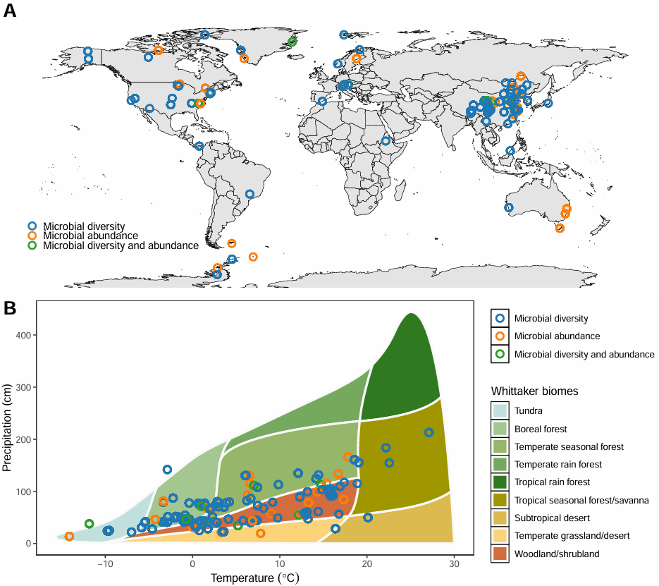 土壤微生物是陆地生态系统中碳与养分循环的核心驱动者,在调节生态系统功能及气候反馈机制中发挥着不可替代的作用。尽管《巴黎协定》为全球温升幅度设定了明确目标,但IPCC最新报告指出,实现该目标仍面临严峻挑战。长期以来,土壤微生物群落在全球尺度上如何响应气候变暖仍属“黑箱”,缺乏系统性认知。本研究首次在全局尺度上明确证实,长期气候变暖会显著降低土壤微生物的物种丰富度(即多样性),从而在“气候变暖”与“微生物多样性丧失”这两个关键变量之间建立起直接、定量的科学联系。